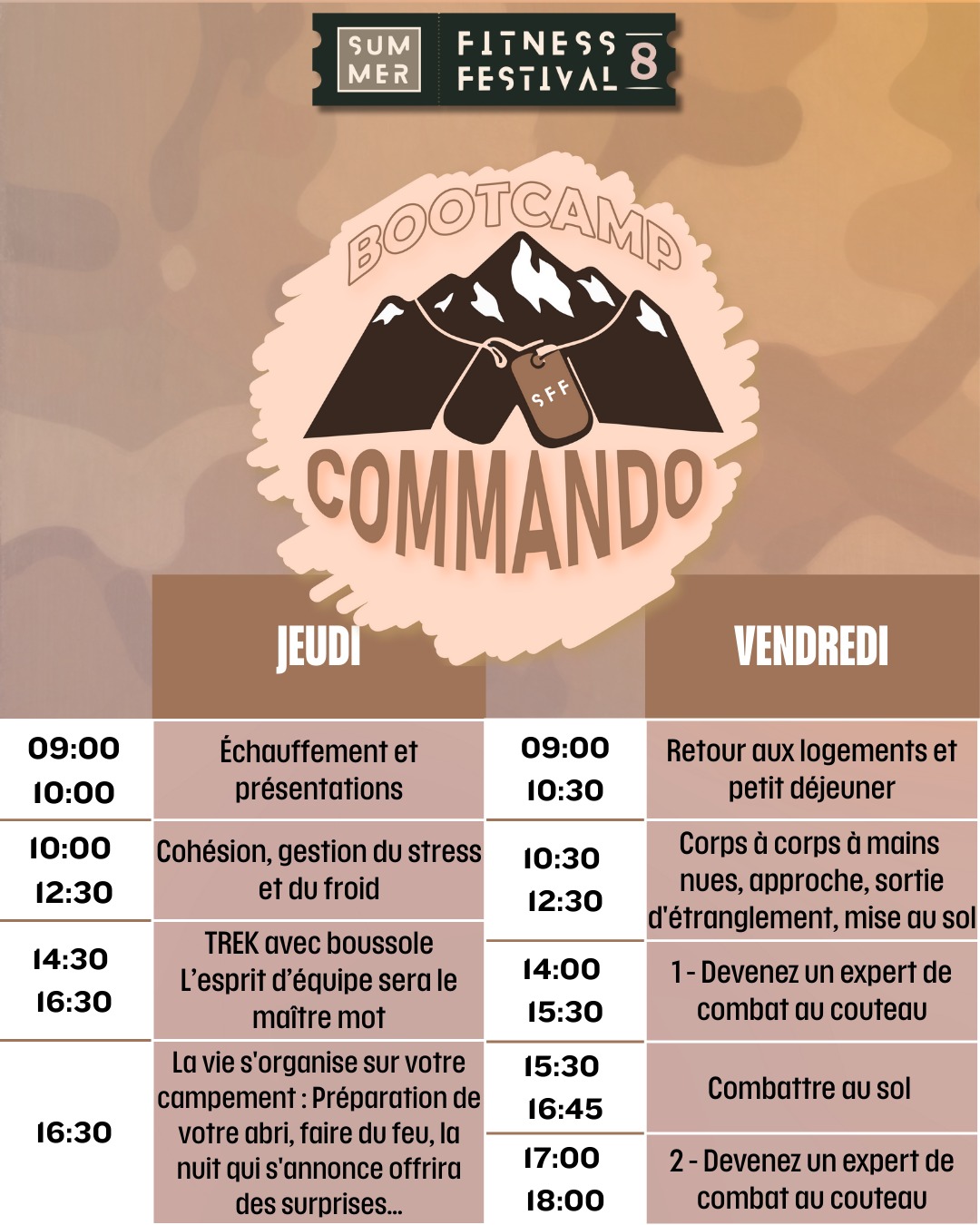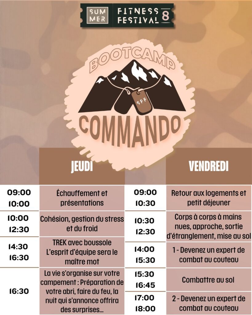 Plongez en immersion totale pour un bootcamp où le mental prend le relais quand le corps abandonne. Entre parcours du combattant, trek d’orientation et techniques de combat, chaque minute est un test. Apprenez le self-défense avec les meilleurs et maîtrisez votre stress face à l’imprévu.